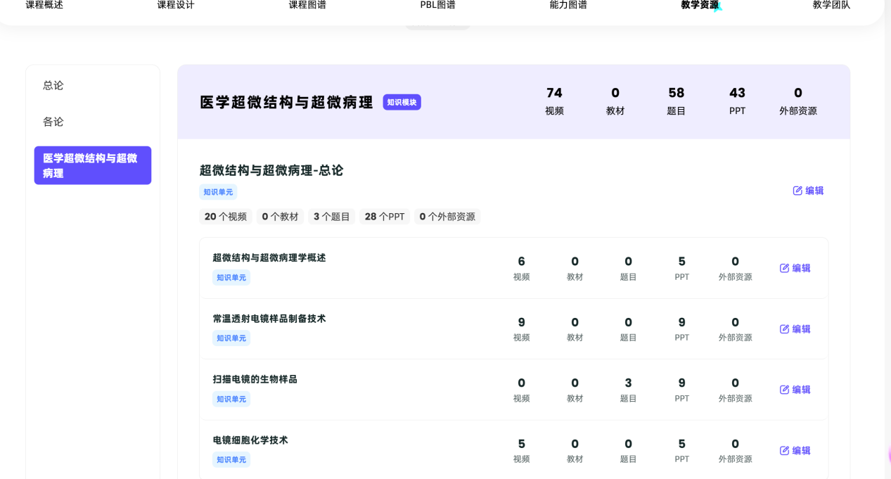 ▲《医学超微结构与超微病理》智慧课程的资源数据汇总